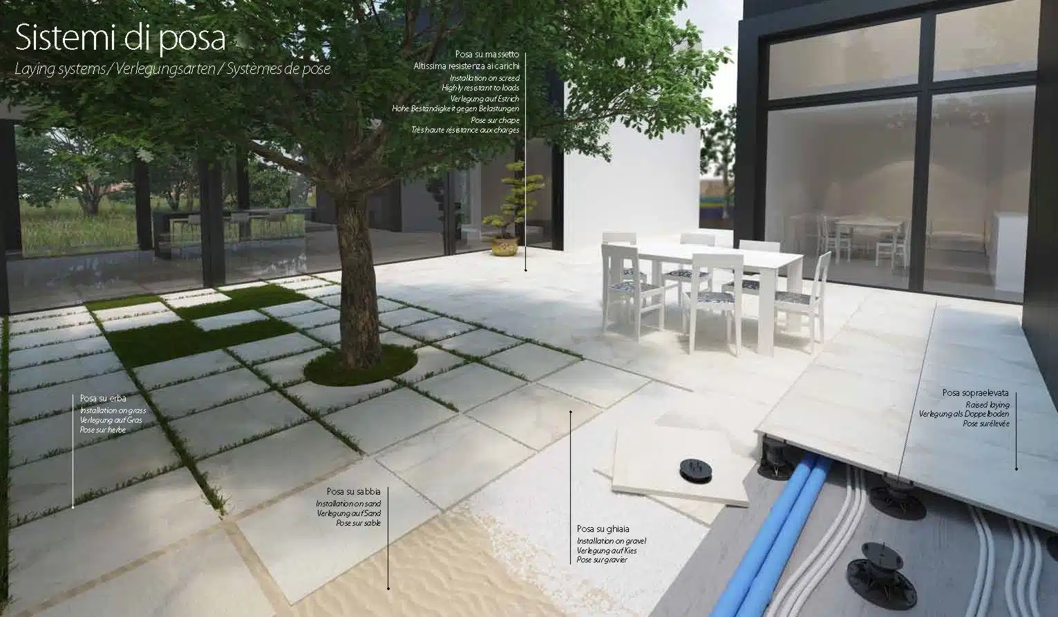 I 5 sistemi di posa di piastrelle da esterno spessore 20 mm: su erba, ghiaia, sabbia, massetto carrabile e sopraelevata